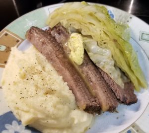 Low Carb Crock Pot Beef Brisket served over Cauliflower Mash, and I’m going to add a wedge of Cabbage that has been cooked in the beef brisket juices to it.