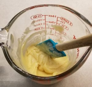 Melt butter until liquid, add the confectioners sweetener, vanilla, maple extract and mix well.