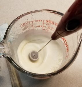 Add heavy whipping cream and mix well. I use a milk frother like this one to mix it until it becomes a light creamy texture.